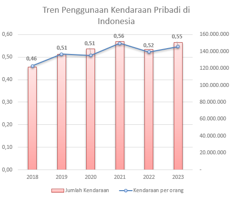 Badan Pusat Statistik melaporkan bahwa jumlah kendaraan bermotor di Indonesia mencapai 157 juta unit di tahun 2023, meningkat 5,95% dari tahun sebelumnya. Pulau Jawa mendominasi peringkat provinsi dengan jumlah kendaraan terbanyak, dengan empat dari enam provinsinya berada di posisi teratas. Kemudian disusul oleh Sumatera Utara di peringkat lima. Data juga menunjukkan terjadi kenaikan jumlah kendaraan pribadi per individu di Indonesia (Gambar 1). Pada tahun 2023, rata-rata tiap individu memiliki 0,55 kendaraan. Dengan kata lain, terdapat satu kendaraan untuk setiap dua penduduk Indonesia.